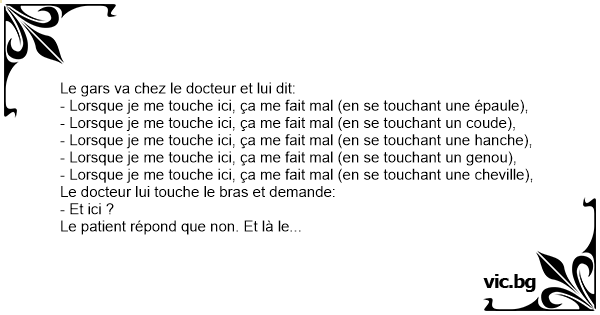 Chez le docteur, un homme appuie avec son doigt aux endroits où il a mal: - Là ... Aïe, c est horrible! Là ... Ouill, c est affreux! Et là ... Aïe, Ouille, c est pire! Mais qu'est ce que j'ai,...