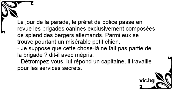 Le jour de la parade, le préfet de police passe en rеvuе les brigades canines exclusivement composées de splendides bergers allemands. Parmi eux se trouve pourtant un misérable petit chien.