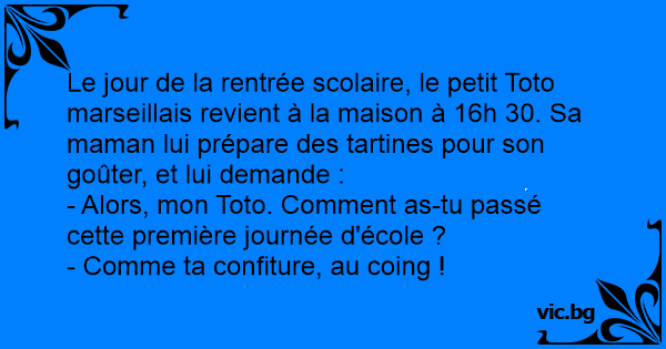 Le jour de la rentrée scolaire, le petit Toto marseillais revient à la maison à 16h 30. Sa maman lui prépare des tartines pour son goûter, et lui demande :