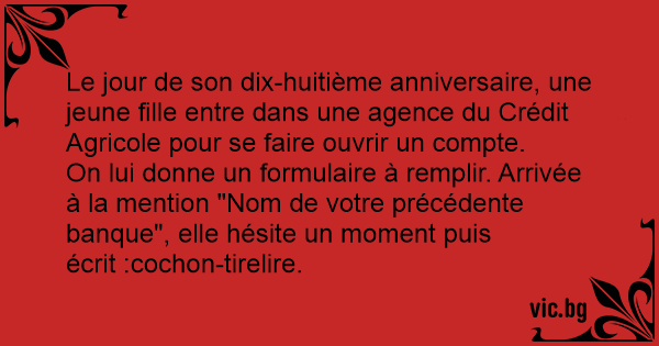On lui donne un formulaire à remplir. Arrivée à la mention "Nom de votre précédente banque", elle hésite un moment puis écrit :cochon-tirelire.