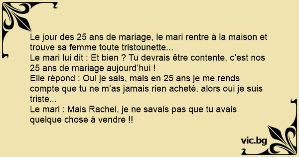 Le mari lui dit : Et bien ? Tu devrais être contente, c’est nos 25 ans de mariage aujourd’hui !