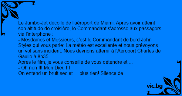 Le Jumbo-Jet décolle de l'aéroport de Miami. Après avoir atteint son altitude de croisière, le Commandant s'adresse aux passagers via l'interphone :