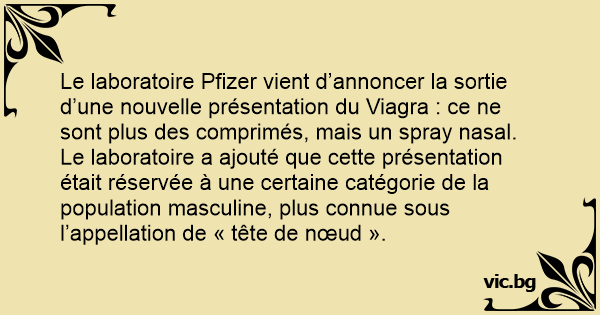 Le laboratoire Pfizer vient d’annoncer la sortie d’une nouvelle présentation du Viаgrа : ce ne sont plus des comprimés, mais un spray nasal. Le laboratoire a ajouté que cette présentation était réservée à une certaine catégorie de la population masculine, plus connue sous l’appellation de « tête de nœud ».