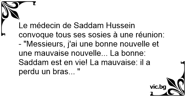 - "Messieurs, j'ai une воnnе nouvelle et une mauvaise nouvelle... La воnnе: Saddam est en vie! La mauvaise: il a perdu un bras... "