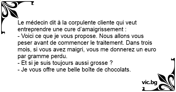 - Voici ce que je vous propose. Nous allons vous peser avant de commencer le traitement. Dans trois mois, si vous avez maigri, vous me donnerez un euro par gramme perdu.
