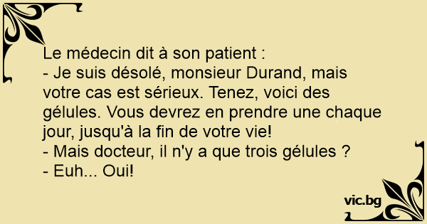 - Je suis désolé, monsieur Durand, mais votre cas est sérieux. Tenez, voici des gélules. Vous devrez en prendre une chaque jour, jusqu'à la fin de votre vie!