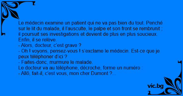 - Oh ! voyons, pensez-vous ! s’exclame le médecin. Est-ce que je peux téléphoner d’ici ?