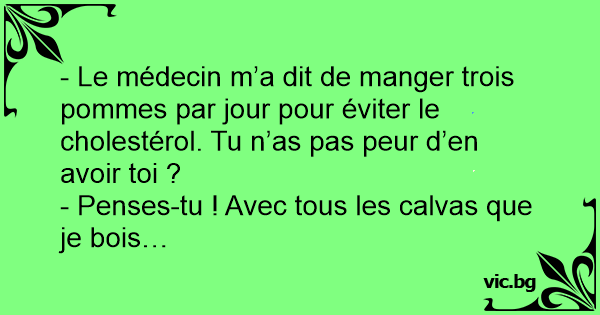 - Le médecin m’a dit de manger trois pommes par jour pour éviter le cholestérol. Tu n’as pas peur d’en avoir toi ?
