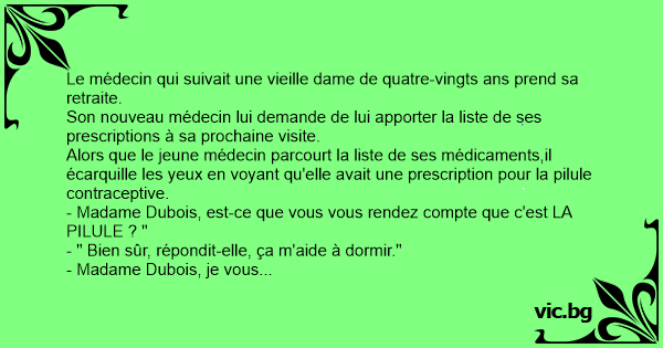- Madame Dubois, je vous assure qu'il n'y a RIEN là-dedans pour faire dormir, ce sont des pilules contraceptives. Vous n'en avez plus besoin.