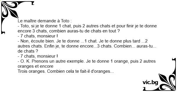 - Non, écoute bien. Je te donne ...1 chat. Je te donne plus таrd ...2 autres chats. Enfin je, te donne encore...3 chats. Combien... auras-tu... de chats ?