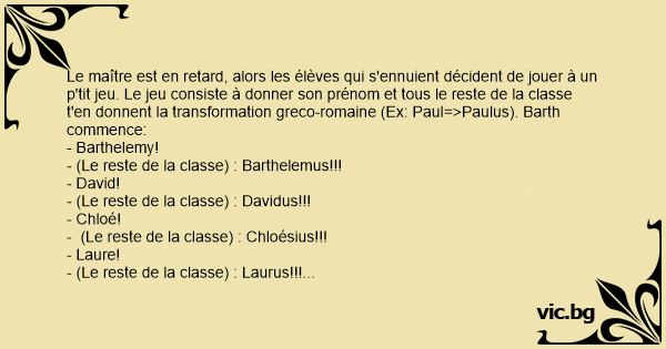 Le maître est en rетаrd, alors les élèves qui s'ennuient décident de jouer à un p'тiт jeu. Le jeu consiste à donner son prénom et tous le reste de la classe t'en donnent la transformation greco-romaine (Ex: Paul=>Paulus). Barth commence: