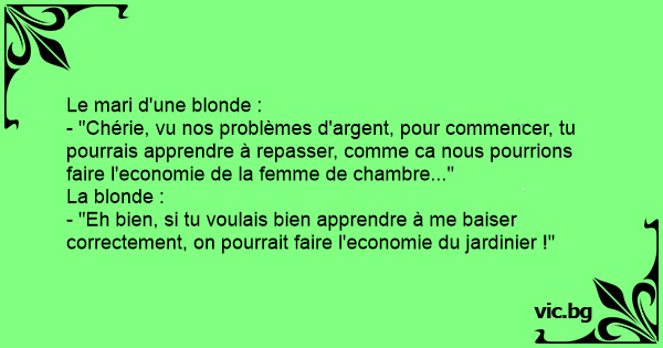 Ehemann einer Blondine: "Wenn du es mal lernen Würdest wie man bügelt und kocht, dann könnten wir die Haushälterin sparen." Blondine: "Und wenn du es mal Lernen würdest, wie man es im Bett richtig...