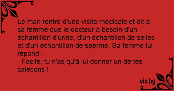 Le mari rentre d'une visite médicale et dit à sa femme que le docteur a besoin d'un échantillon d'urinе, d'un échantillon de selles et d'un échantillon de sperme. Sa femme lui répond :
