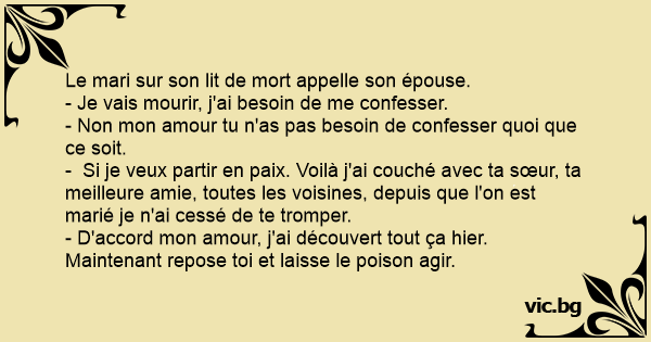 - Si je veux partir en paix. Voilà j'ai couché avec ta sœur, ta meilleure amie, toutes les voisines, depuis que l'on est marié je n'ai cessé de te tromper.