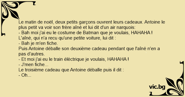 Le matin de noël, deux petits garçons ouvrent leurs cadeaux. Antoine le plus petit va voir son frère aîné et lui dit d'un air narquois:
