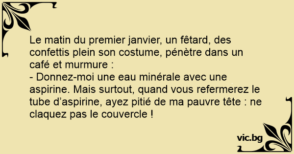 Le matin du premier janvier, un fêtard, des confettis plein son costume, pénètre dans un café et murmure :