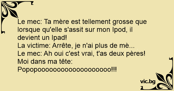 Le mec: Ta mère est tellement grosse que lorsque qu'elle s'assit sur mon Ipod, il devient un Ipad!