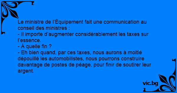 - Eh bien quand, par ces taxes, nous aurons à moitié dépouillé les automobilistes, nous pourrons construire davantage de postes de péage, pour finir de soutirer leur argent.