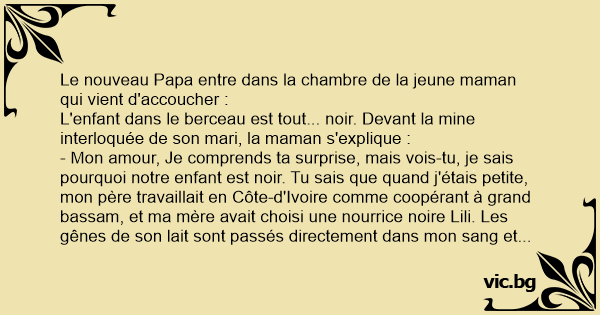 - Mon amour, Je comprends ta surprise, mais vois-tu, je sais pourquoi notre enfant est noir. Tu sais que quand j'étais petite, mon père travaillait en Côte-d'Ivoire comme coopérant à grand bassam, et ma mère avait choisi une nourrice noire Lili. Les gênes de son lait sont passés directement dans mon sang et voilà pourquoi notre enfant est noir.