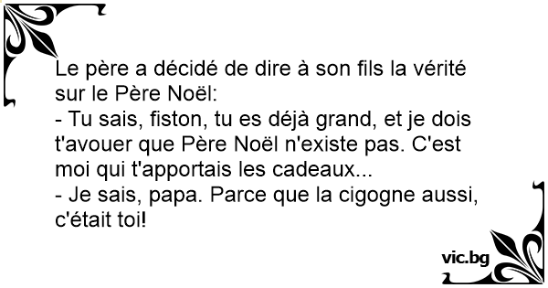 - Tu sais, fiston, tu es déjà grand, et je dois t'avouer que Père Noël n'existe pas. C'est moi qui t'apportais les cadeaux...