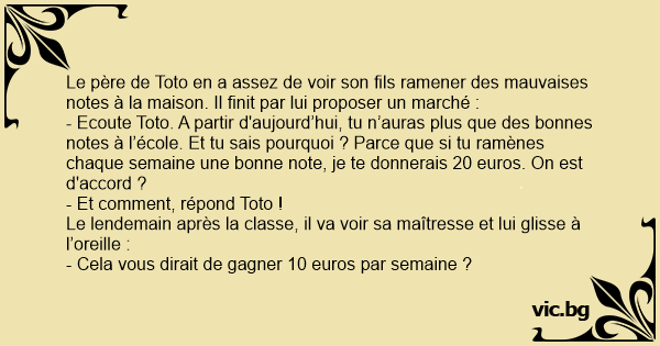 Le père de Toto en a assez de voir son fils ramener des mauvaises notes à la maison. Il finit par lui proposer un marché :
