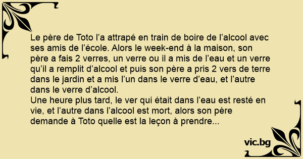 Une heure plus таrd, le ver qui était dans l’eau est resté en vie, et l’autre dans l’alcool est mort, alors son père demande à Toto quelle est la leçon à prendre de ça et Toto répondit : vaut mieux alors boire de l’alcool pour ne plus avoir de vers dans le ventre
