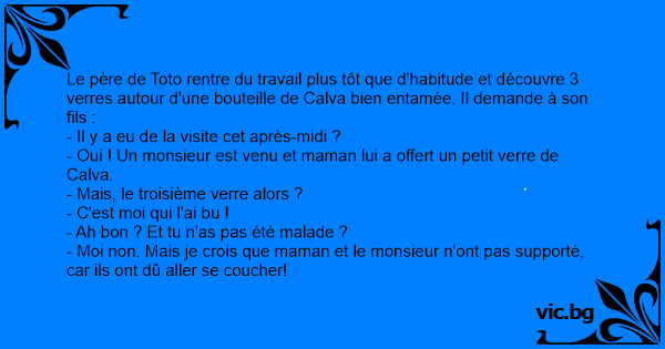 Le père de Toto rentre du travail plus tôt que d'habitude et découvre 3 verres autour d'une bouteille de Calva bien entamée. Il demande à son fils :