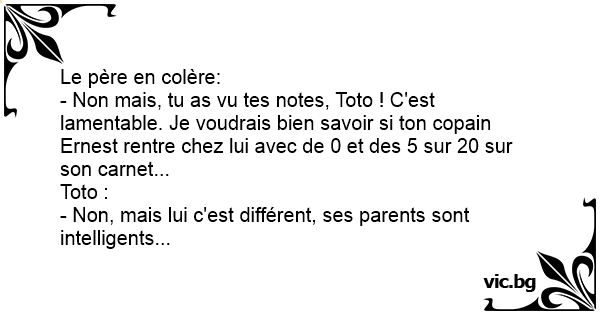 - Non mais, tu as vu tes notes, Toto ! C'est lamentable. Je voudrais bien savoir si ton copain Ernest rentre chez lui avec de 0 et des 5 sur 20 sur son carnet...