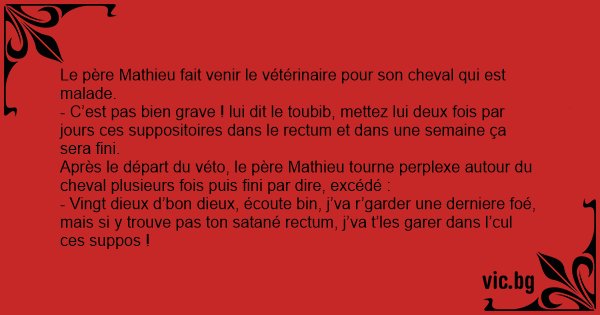 - C’est pas bien grave ! lui dit le toubib, mettez lui deux fois par jours ces suppositoires dans le rестuм et dans une semaine ça sera fini.