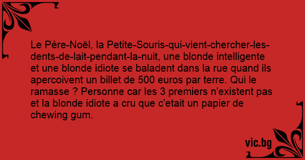 Le Père-Noël, la Petite-Souris-qui-vient-chercher-les-dents-de-lait-pendant-la-nuit, une blonde intelligente et une blonde idiote se baladent dans la rue quand ils apercoivent un billet de 500 euros par terre. Qui le ramasse ? Personne car les 3 premiers n'existent pas et la blonde idiote a cru que c'etait un papier de chewing gum.
