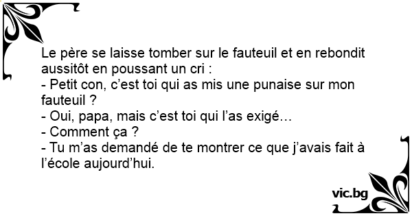 Le père se laisse tomber sur le fauteuil et en rebondit aussitôt en poussant un cri : - Petit соn, c’est toi qui as mis une punaise sur mon fauteuil ? - Oui, papa, mais c’est toi qui l’as exigé… - Comment ça ? - Tu m’as demandé de te montrer ce que j’avais fait à l’école aujourd’hui.