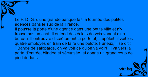 Il pousse la porte d'une agence dans une petite ville et n'y trouve pas un chat. Il entend des éclats de voix venant d'un bureau. Il entrouvre discrètement la porte et, stupéfait, il voit les quatre employés en train de faire une belote. Furieux, il se dit :