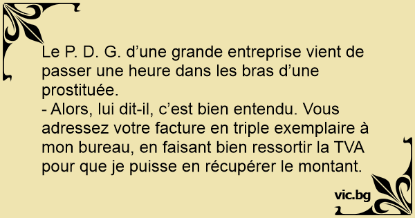- Alors, lui dit-il, c’est bien entendu. Vous adressez votre facture en triple exemplaire à mon bureau, en faisant bien ressortir la TVA pour que je puisse en récupérer le montant.