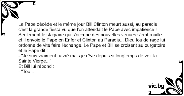 Le Pape décède et le même jour Bill Clinton meurt aussi, au paradis c'est la grande fiesta vu que l'on attendait le Pape avec impatience !