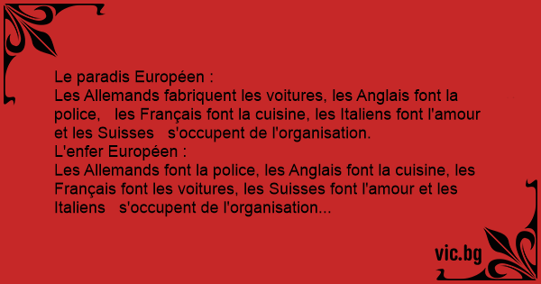 Les Allemands fabriquent les voitures, les Anglais font la police, les Français font la cuisine, les Italiens font l'amour et les Suisses s'occupent de l'organisation.