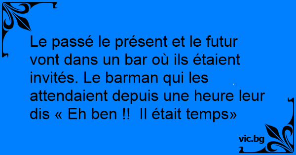 Le passé le présent et le futur vont dans un bar où ils étaient invités. Le barman qui les attendaient depuis une heure leur dis « Eh ben !! Il était temps»