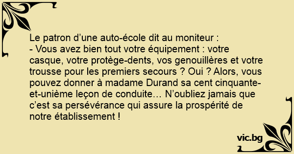 - Vous avez bien tout votre équipement : votre casque, votre protège-dents, vos genouillères et votre trousse pour les premiers secours ? Oui ? Alors, vous pouvez donner à madame Durand sa cent cinquante-et-unième leçon de conduite… N’oubliez jamais que c’est sa persévérance qui assure la prospérité de notre établissement !