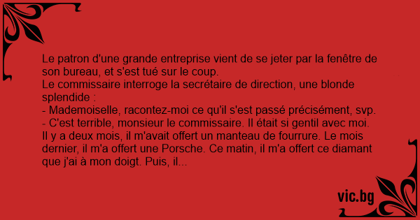 - C'est terrible, monsieur le commissaire. Il était si gentil avec moi. Il y a deux mois, il m'avait offert un manteau de fourrure. Le mois dernier, il m'a offert une Porsche. Ce matin, il m'a offert ce diamant que j'ai à mon doigt. Puis, il m'a demandé ce qu'il pourrait bien m'offrir afin d'obtenir mes faveurs. Je lui ai répondu que généralement, tous les cadres de l'entreprise me donnaient 250 euros, pour ça. Et c'est là qu'il a sauté par la fenêtre!