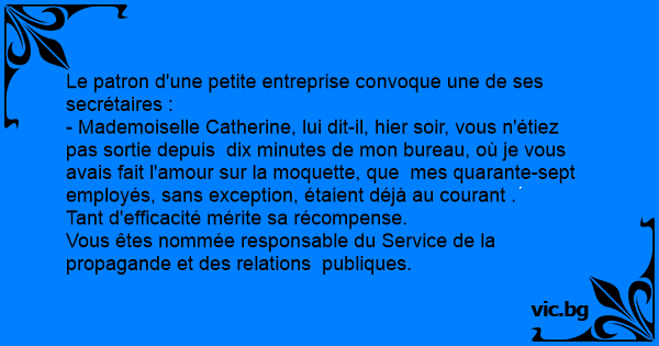 - Mademoiselle Catherine, lui dit-il, hier soir, vous n'étiez pas sortie depuis dix minutes de mon bureau, où je vous avais fait l'amour sur la moquette, que mes quarante-sept employés, sans exception, étaient déjà au courant .