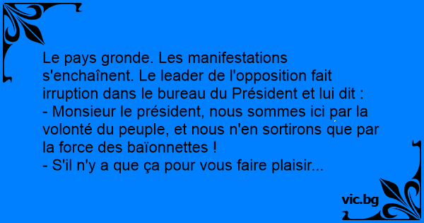 Le pays gronde. Les manifestations s'enchaînent. Le leader de l'opposition fait irruption dans le bureau du Président et lui dit :