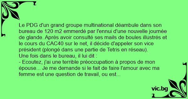Le PDG d'un grand groupe multinational déambule dans son bureau de 120 m2 emmerdé par l'ennui d'une nouvelle journée de glande. Après avoir consulté ses mails de boules illustrés et le cours du CAC40 sur le net, il décide d'appeler son vice président (plongé dans une partie de Tetris en réseau).