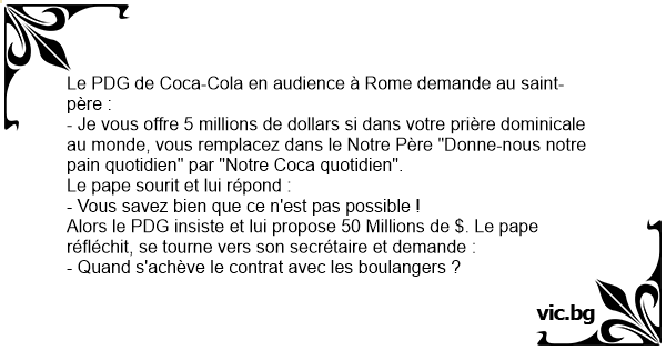 Alors le PDG insiste et lui propose 50 Millions de $. Le pape réfléchit, se tourne vers son secrétaire et demande :