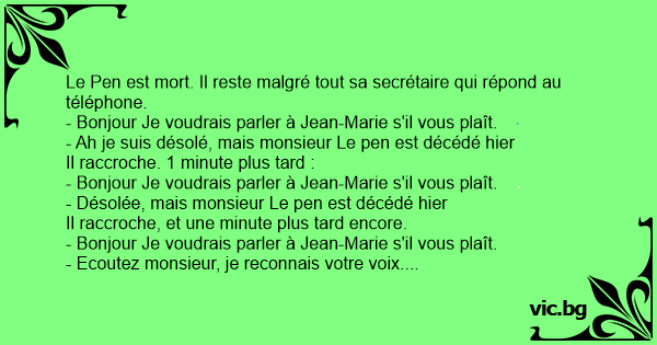 - Ecoutez monsieur, je reconnais votre voix. C'est la troisième fois que je vous dis que monsieur Le Pen est décédé hier. !!!