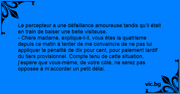 - Chère madame, explique-t-il, vous êtes la quatrième depuis ce matin à tenter de me convaincre de ne pas lui appliquer la pénalité de dix pour cent, pour paiement tardif du tiers provisionnel. Compte tenu de cette situation, j’espère que vous-même, de votre côté, ne serez pas opposée à m’accorder un petit délai.