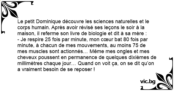 Le petit Dominique découvre les sciences naturelles et le corps humain. Après avoir révisé ses leçons le soir à la maison, il referme son livre de biologie et dit à sa mère :