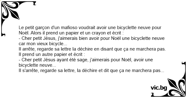 Le petit garçon d'un mafioso voudrait avoir une bicyclette neuve pour Noël. Alors il prend un papier et un crayon et écrit :