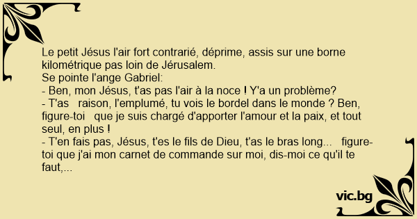 - T'en fais pas, Jésus, t'es le fils de Dieu, t'as le bras long... figure-toi que j'ai mon carnet de commande sur moi, dis-moi ce qu'il te faut, et je m'occupe de tout.