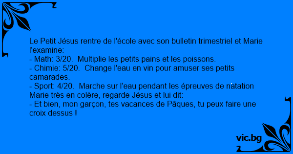 Le Petit Jésus rentre de l'école avec son bulletin trimestriel et Marie l'examine: