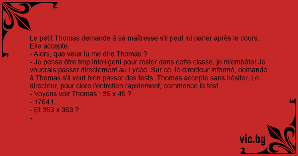 - Je pense être trop intelligent pour rester dans cette classe, je m'embête! Je voudrais passer directement au Lycée. Sur ce, le directeur informé, demande à Thomas s'il veut bien passer des tests. Thomas accepte sans hésiter. Le directeur, pour clore l'entretien rapidement, commence le test.