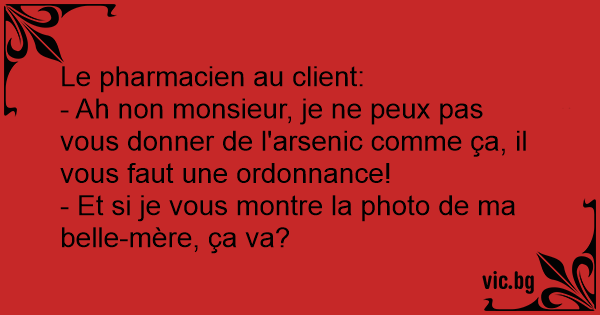 C'est un gars qui entre dans une pharmacie : - Je voudrais un litre d'arsenic. - Grands Dieux ! Pourquoi faire ? - Pour ma femme. - Ah... et euuuuh... Vous avez une ordonnance ? - Non mais je peux...